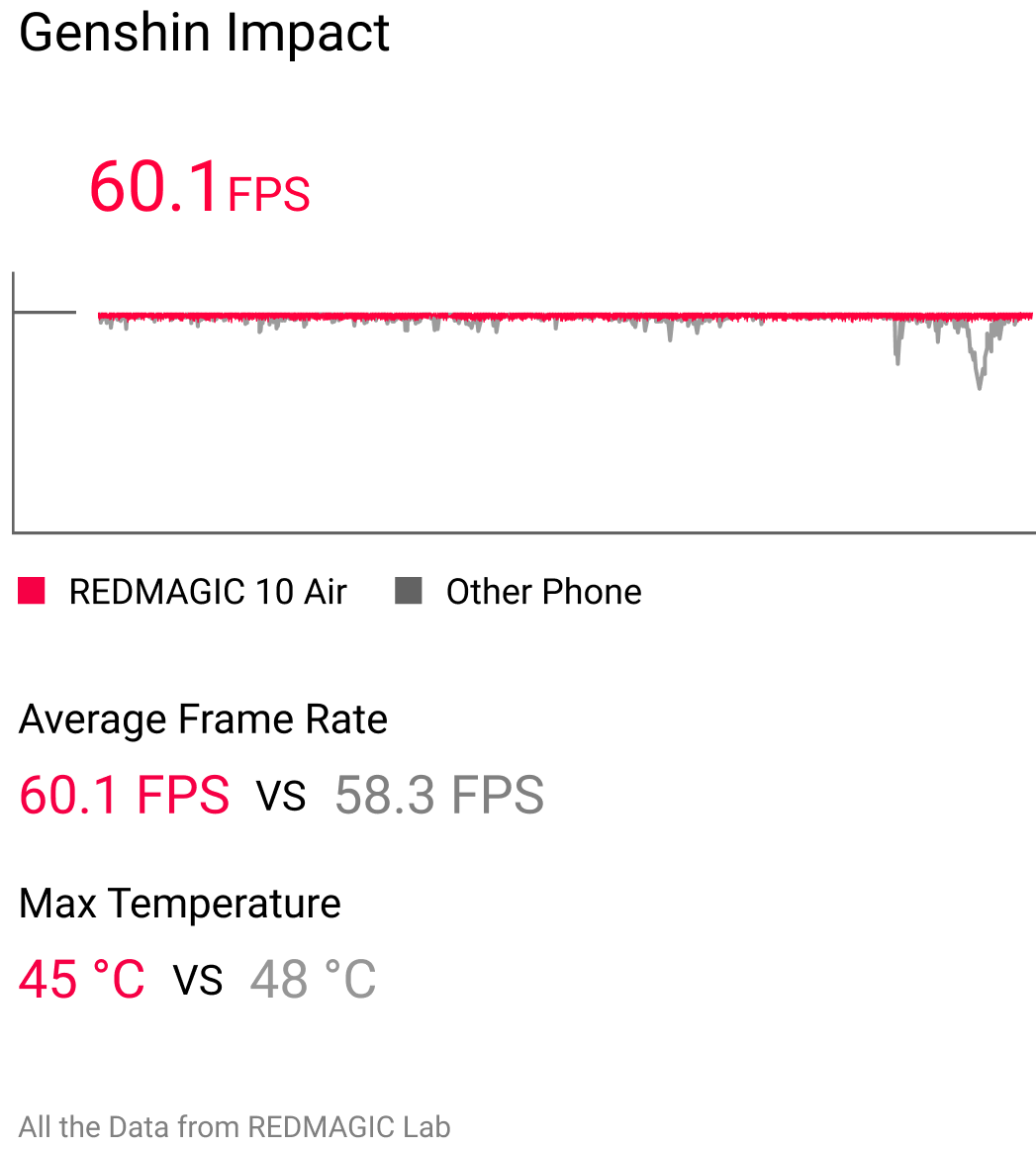 After 1 hour of playing Genshin Impact, the REDMAGIC 10 Air reaches a maximum temperature of 45°C, while the rival device heats up to 48°C.